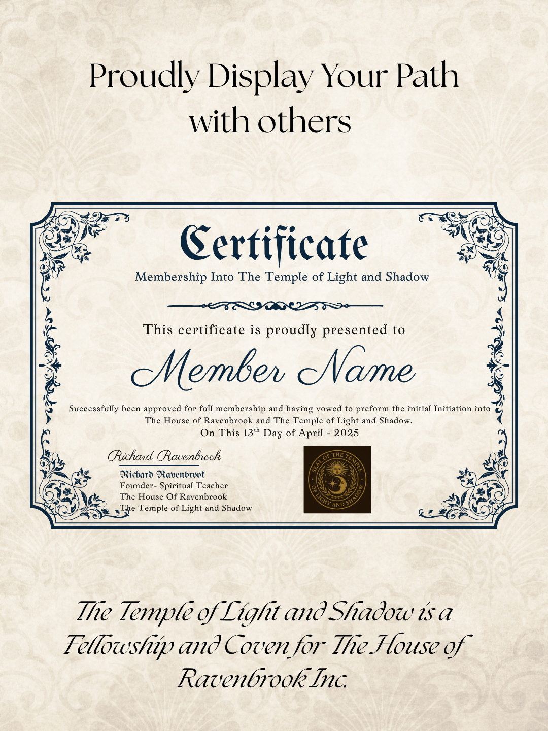 Upon joining, you will receive your Certificate of Membership, a consecrated token acknowledging your place among the Fellowship. It bears the seal of the Temple and the emblem of the eternal flame—symbol of divine light that dwells within every seeker.